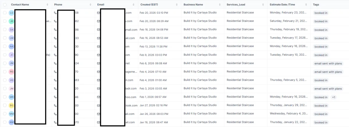 Each new lead is saved with the service type and status (booked in, plans received, etc.), so nothing gets lost and you can see what’s happening at a glance.