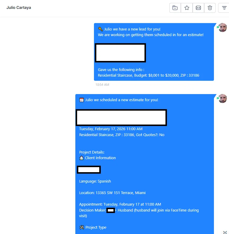 As soon as a lead qualifies or books, you receive a clear summary (project type, budget range, ZIP, appointment time). You don’t have to chase information.